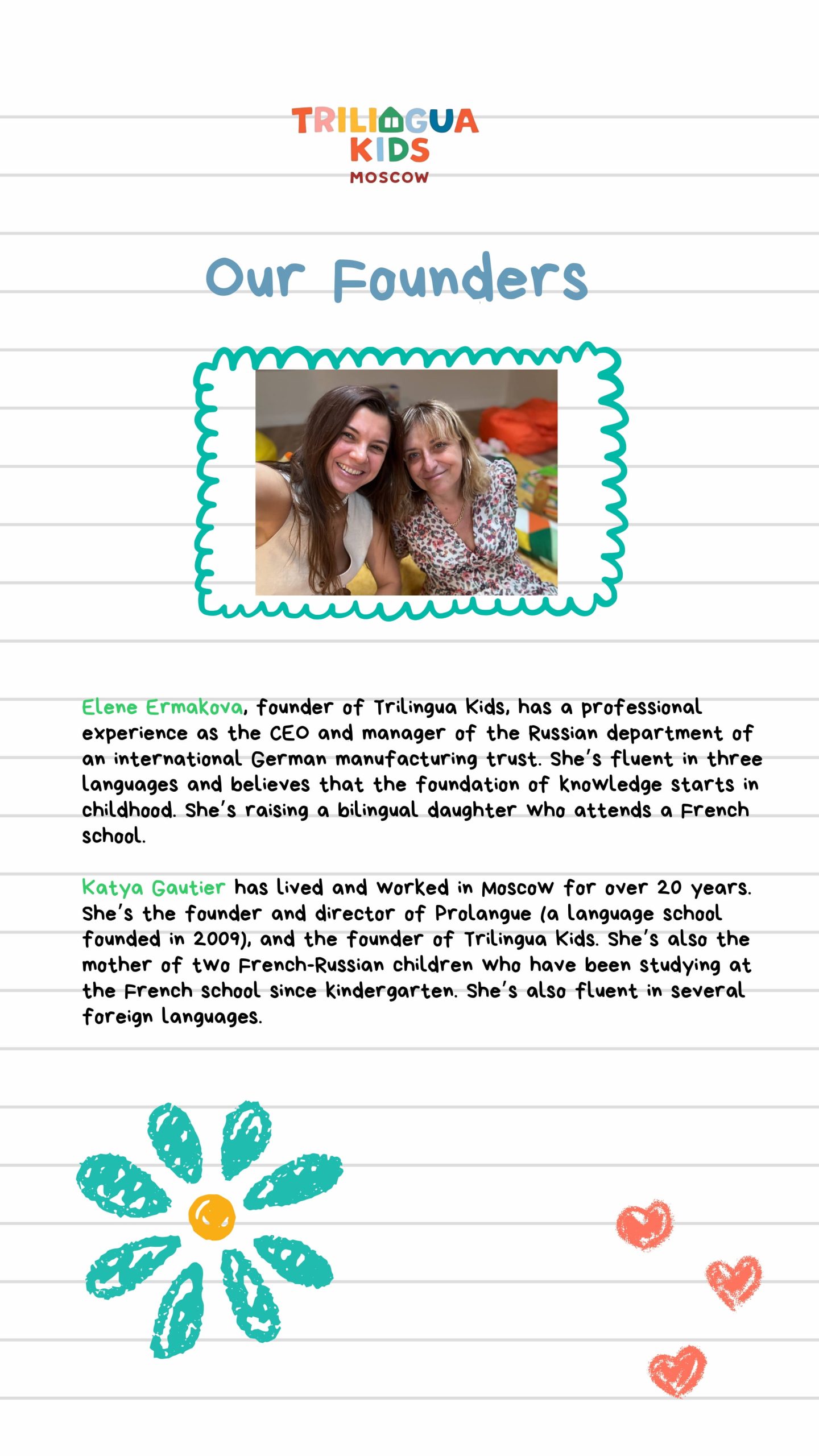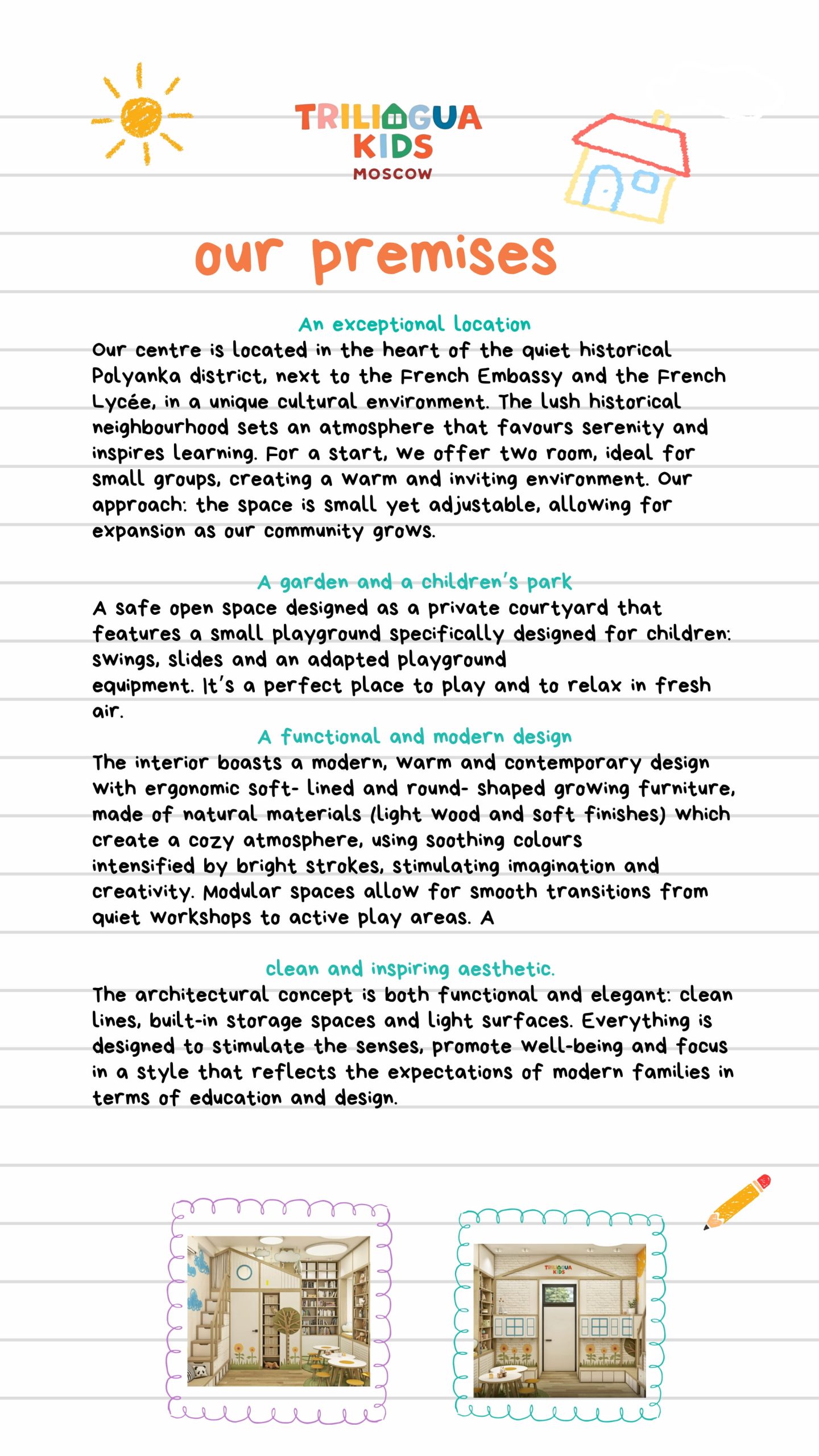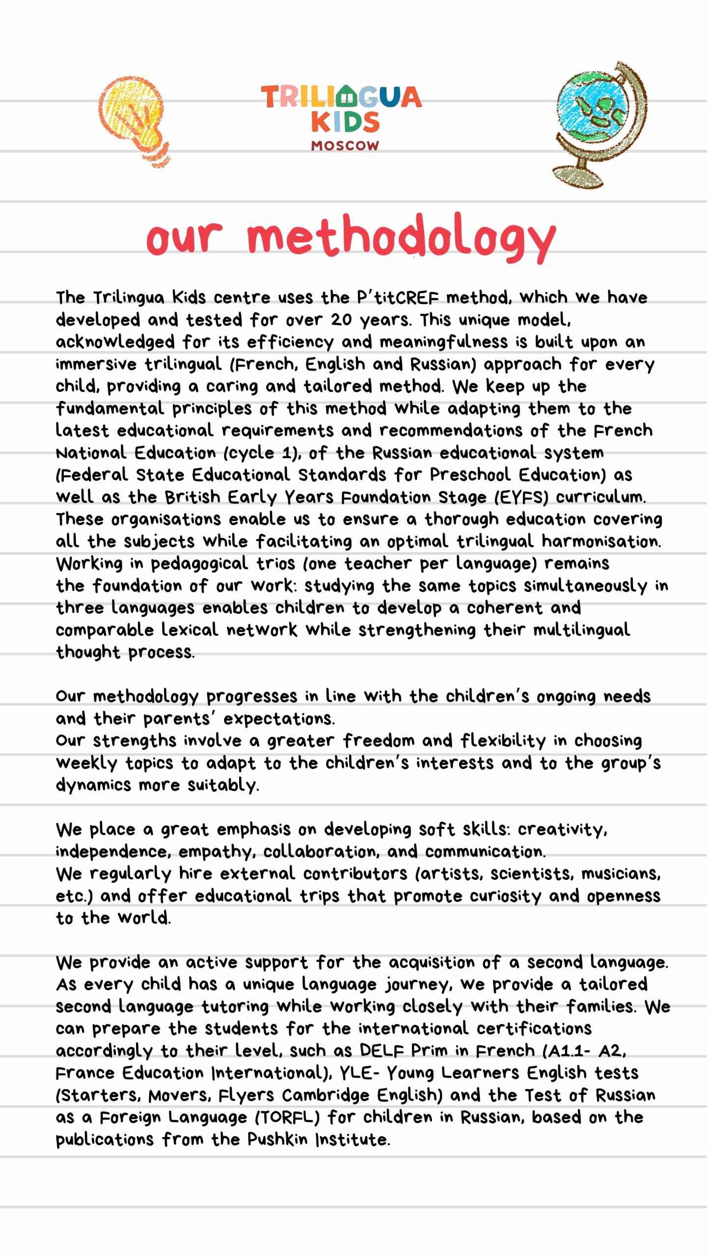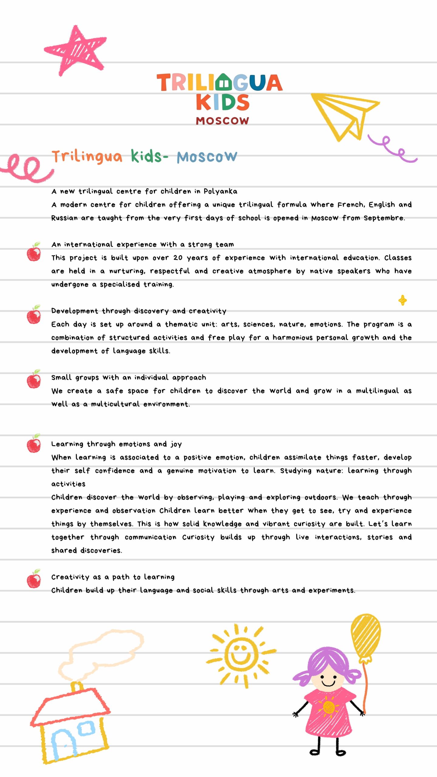 Learning through emotions and joyWhen learning is connected to positive emotions, a child remembers faster, develops self-confidence, and gains genuine motivation for knowledge. Start now Exploring nature: learning through action.Children discover the world by observing, playing, and exploring it outdoors. Start now We learn through experience and observationChildren learn more easily when they can see, try, and experience things for themselves—this is how deep understanding and genuine curiosity develop. Start now We learn together through communication.Curiosity grows through lively interaction, storytelling, and shared discoveries. Start now Creativity as a path to learning.Through art and experimentation, children develop language and social skills. Start now Got questions ? Contact-us Name Email Message Send Trilingua KidsChildren's developmental center in Moscow