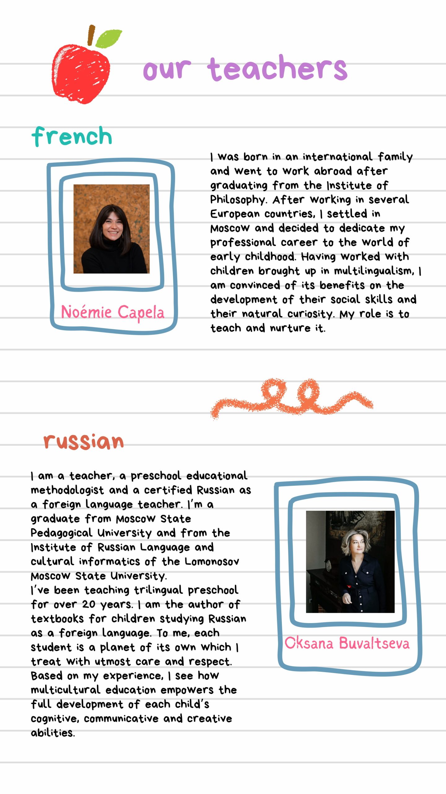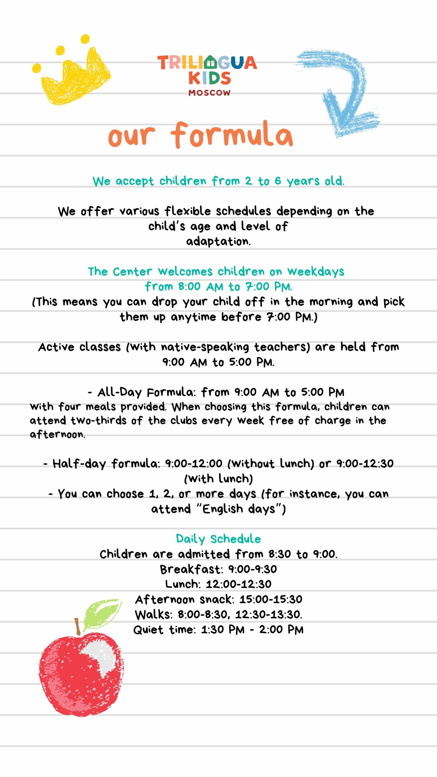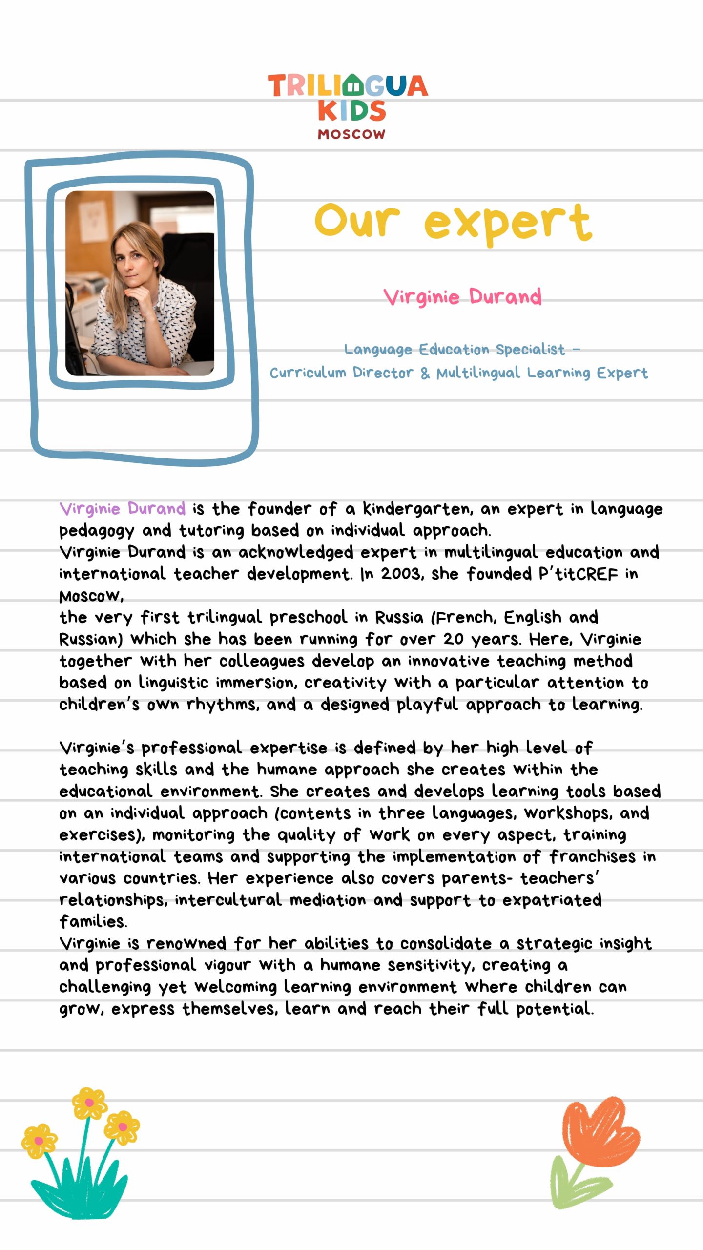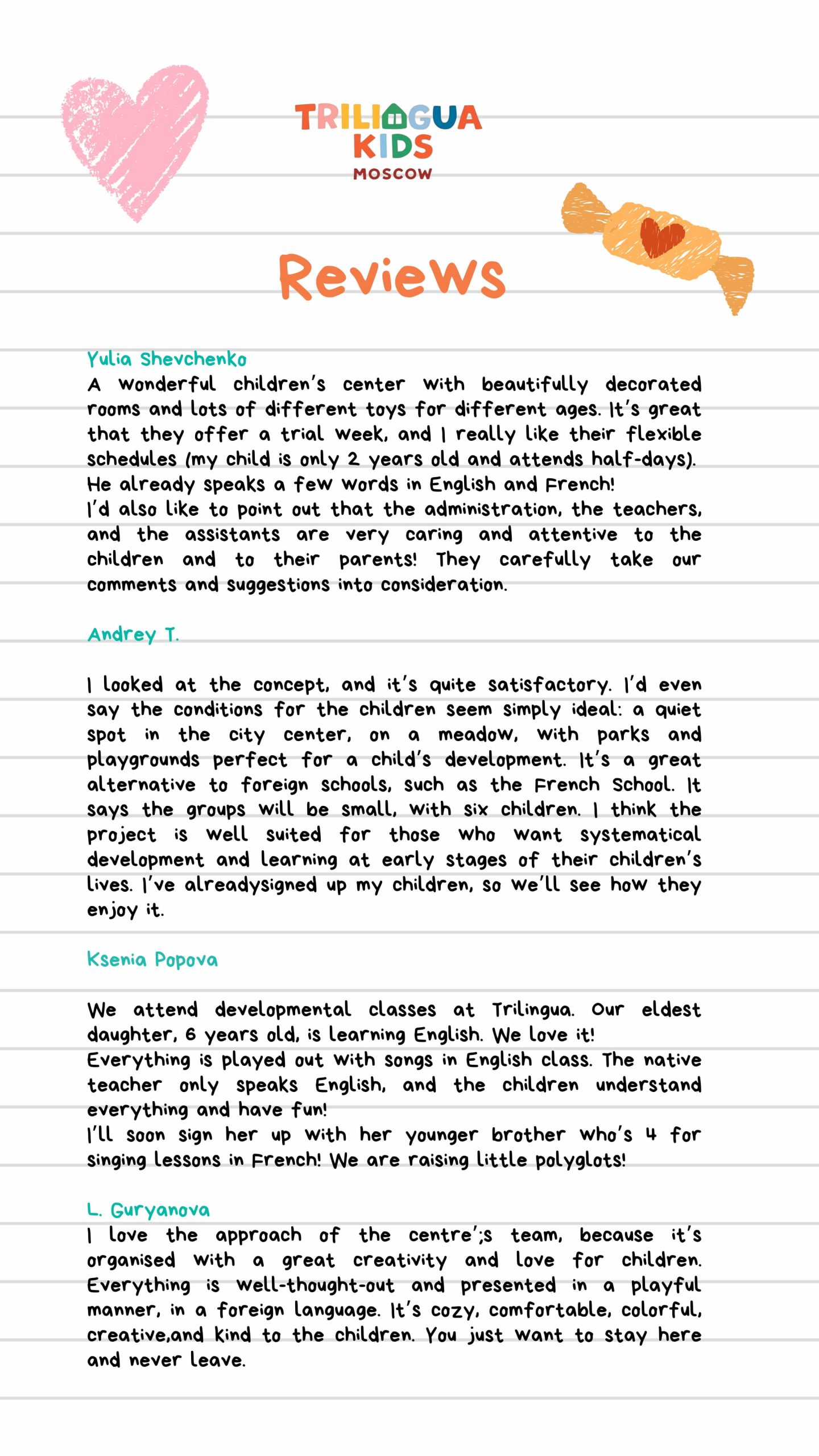 Learning through emotions and joyWhen learning is connected to positive emotions, a child remembers faster, develops self-confidence, and gains genuine motivation for knowledge. Start now Exploring nature: learning through action.Children discover the world by observing, playing, and exploring it outdoors. Start now We learn through experience and observationChildren learn more easily when they can see, try, and experience things for themselves—this is how deep understanding and genuine curiosity develop. Start now We learn together through communication.Curiosity grows through lively interaction, storytelling, and shared discoveries. Start now Creativity as a path to learning.Through art and experimentation, children develop language and social skills. Start now Got questions ? Contact-us Name Email Message Send Trilingua KidsChildren's developmental center in Moscow